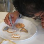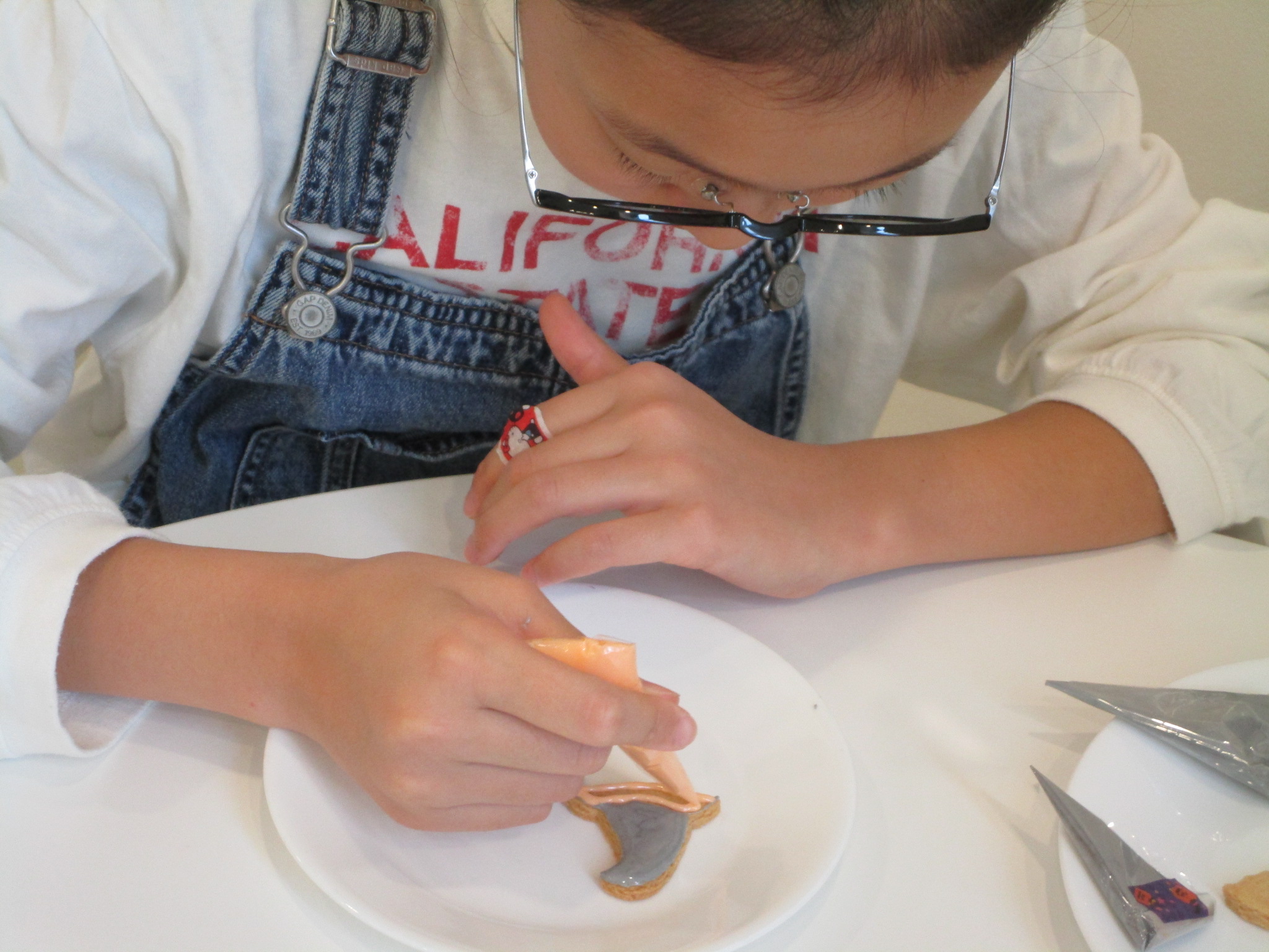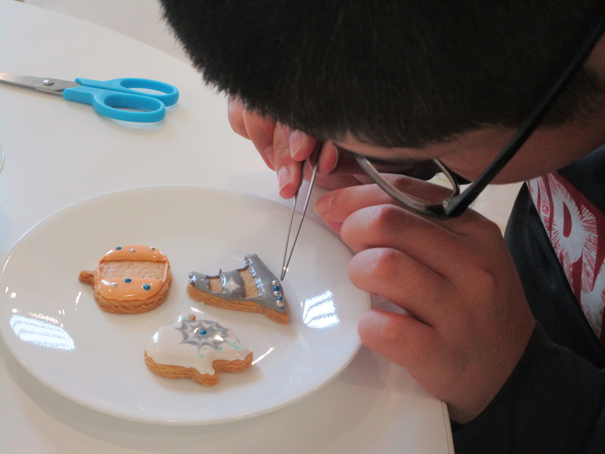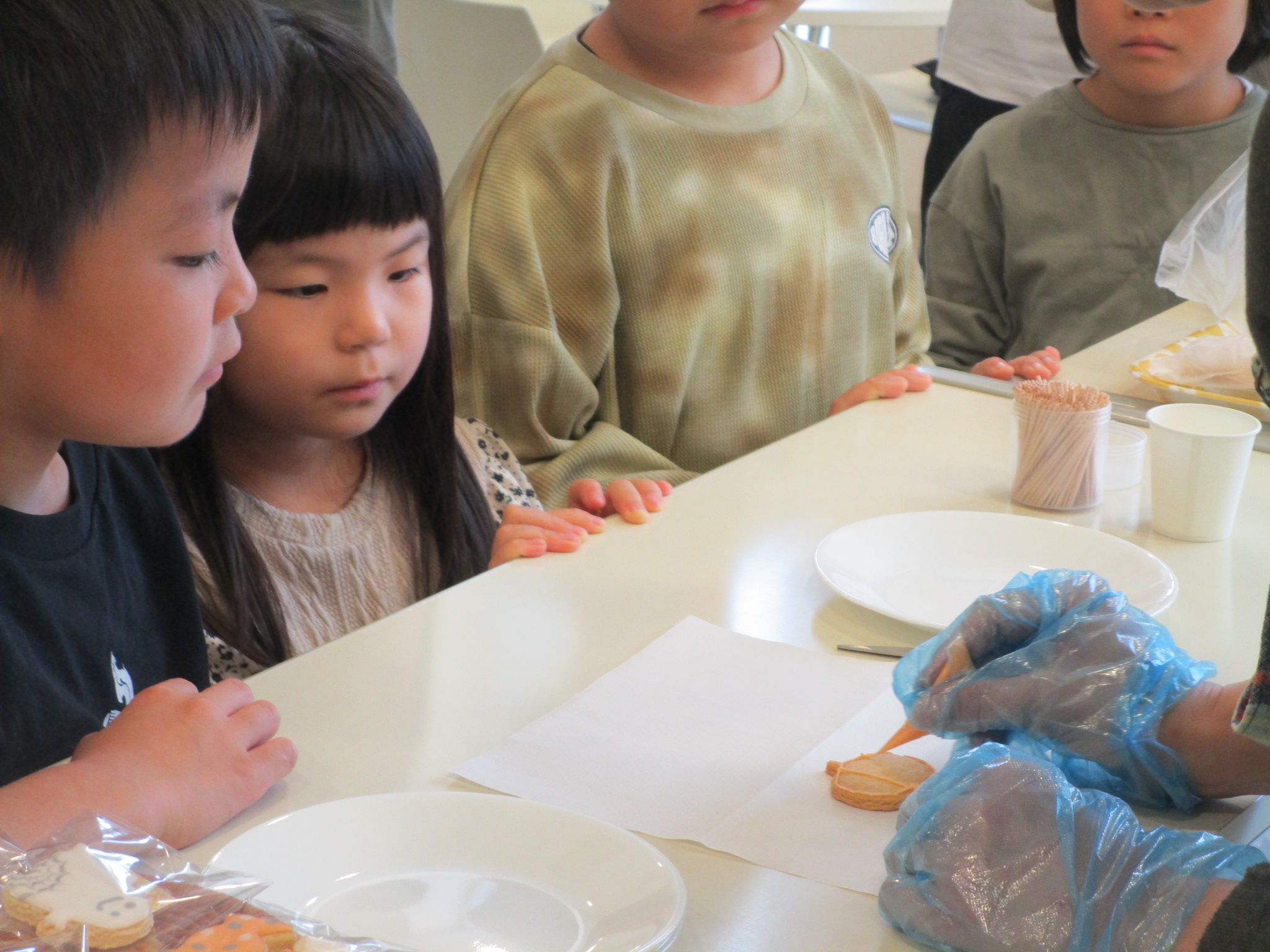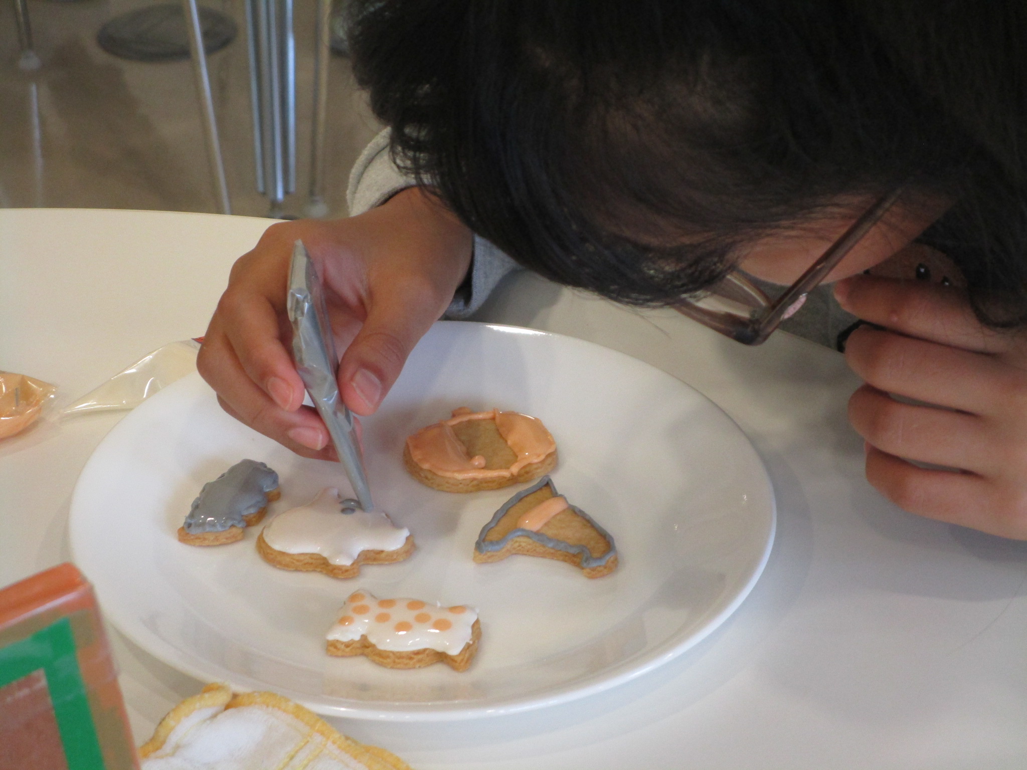 10月26日(日)、講師にクマコティさんをお迎えし、みんなでクッキングSP「アイシングクッキー」を開催しました。 アイシングクッキーとは、焼き上げたクッキーをキャンバスに、粉砂糖と卵白などを混ぜ合わせた甘いクリームで色鮮やかな装飾を施したお菓子のことです。 今回は、ハロウィン月ということで、事前に準備されたクッキーに、5種類のかぼちゃやお化けを彩りました。 着色料や香料で色や風味を変化させたり、絞り出し袋の口金を変えることで、様々な表現が可能なアイシング! 蜘蛛の巣の作り方や、星、ハートの書き方も教えて頂きましたよ~! 参加された皆さんは、同じ材料を使っていても、同じものはなく、自分だけのアイシングを楽しまれていました!! |